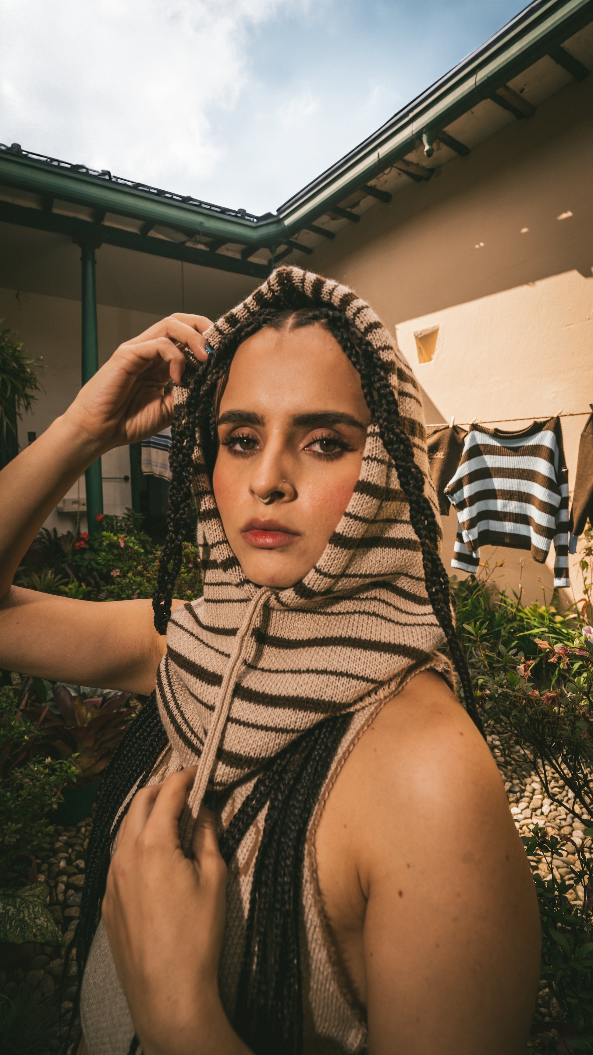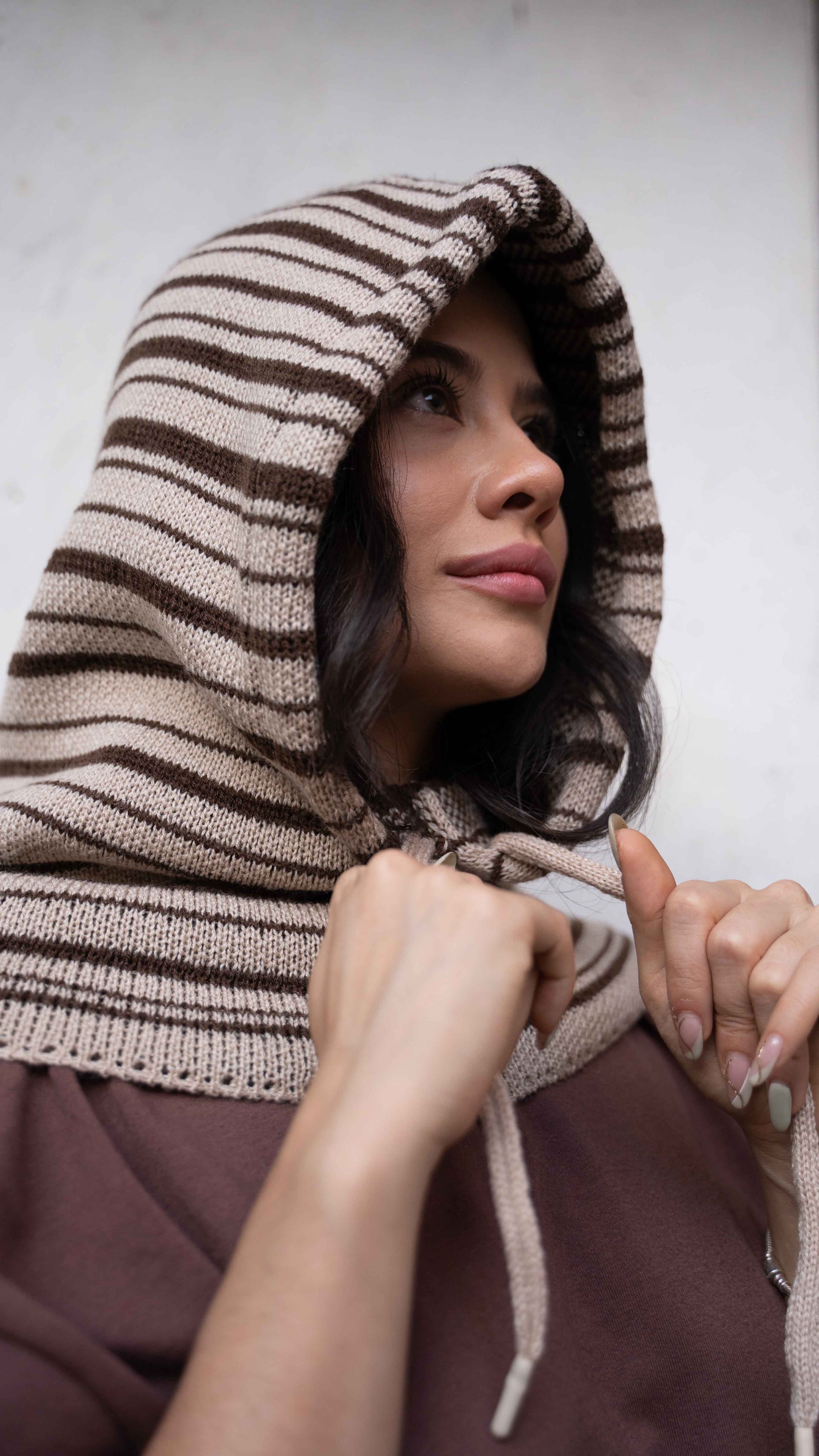 Balaclava tejida en jaqcuard, hilo acrílico. con cordón ajustable y punteras-