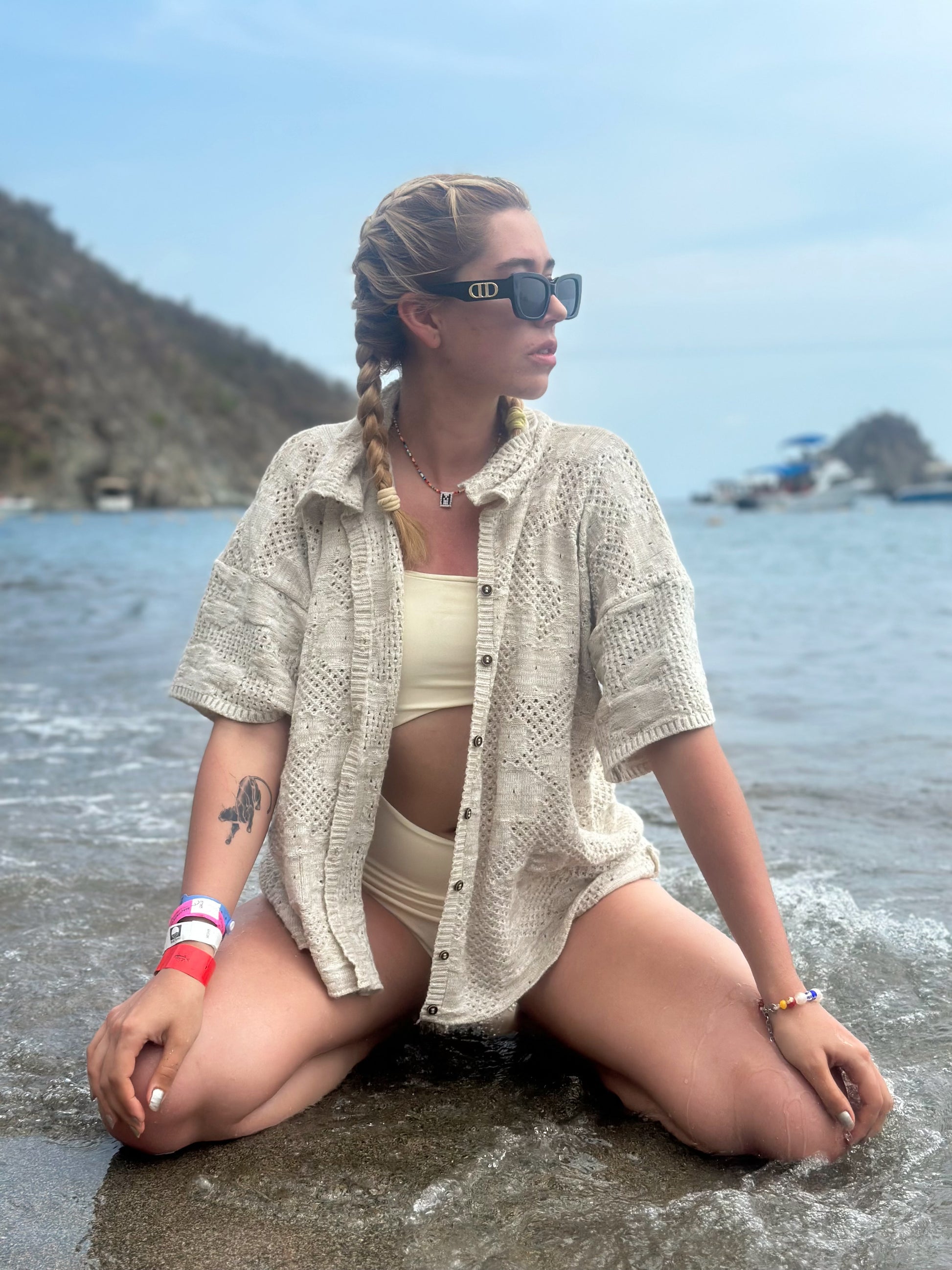Camisa tejida en hilo viscosa, tejido tipo menguado con grabado de flores, tejido fresco y liviano, botones en madera.